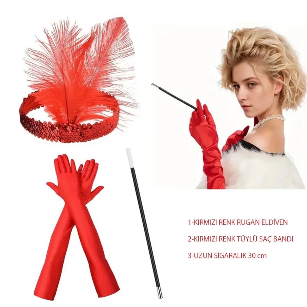 Göz alıcı kırmızı detaylarla şıklığınızı ön plana çıkaracak Kırmızı 3&rsquolü Kostüm Aksesuar Seti, özel davetler, partiler, kına geceleri, bekârlığa veda organizasyonları ve 1920&rsquoler konseptli etkinlikler için mükemmel bir seçimdir.