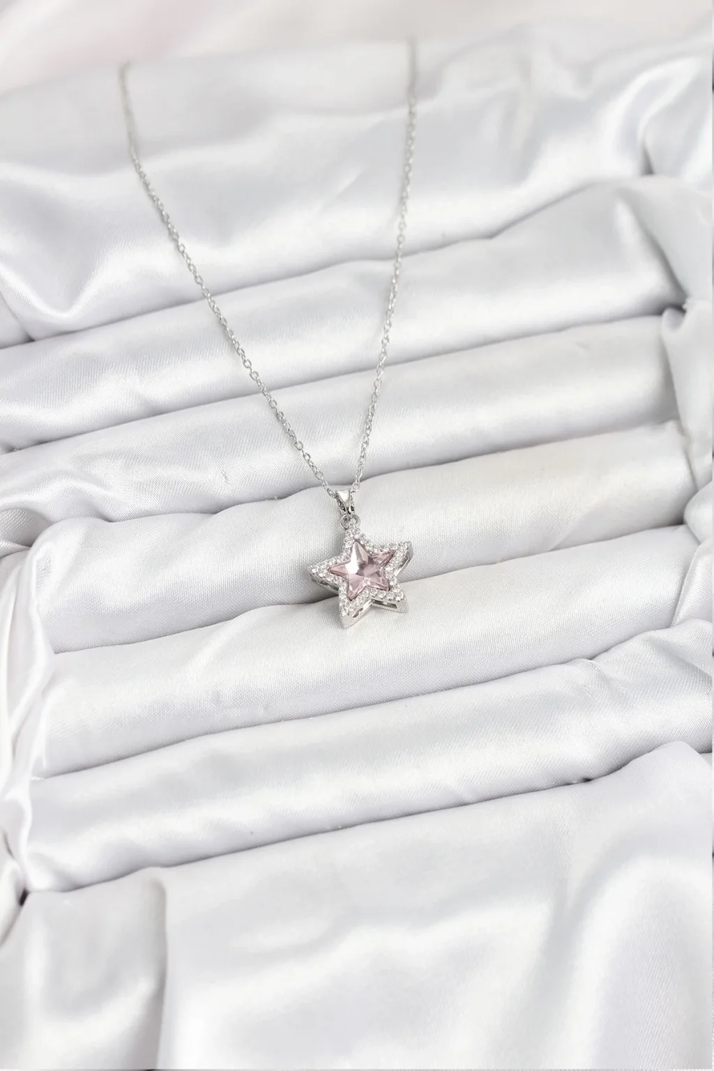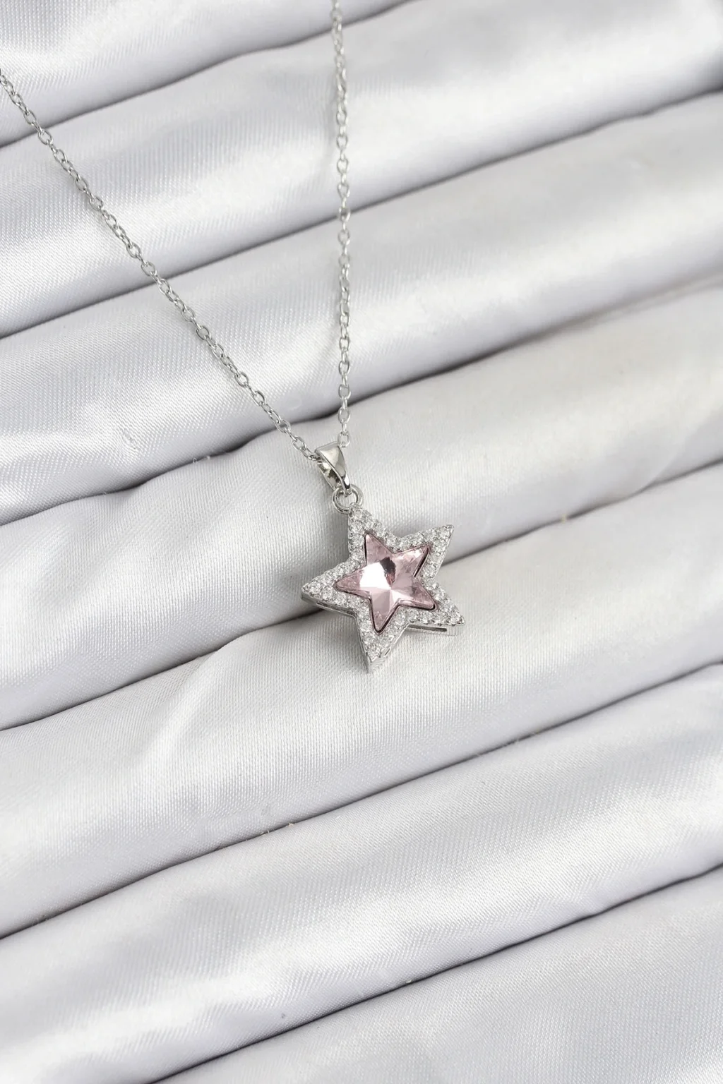 Populermarketim - 316l Çelik Zincir Gümüş Renk Pembe Taşlı Yıldız Model Kadın Kolye