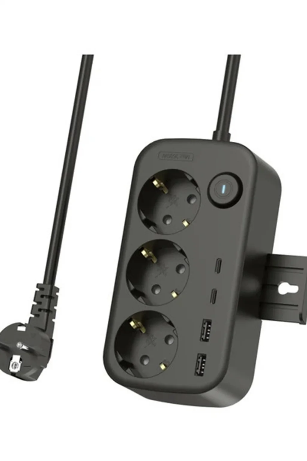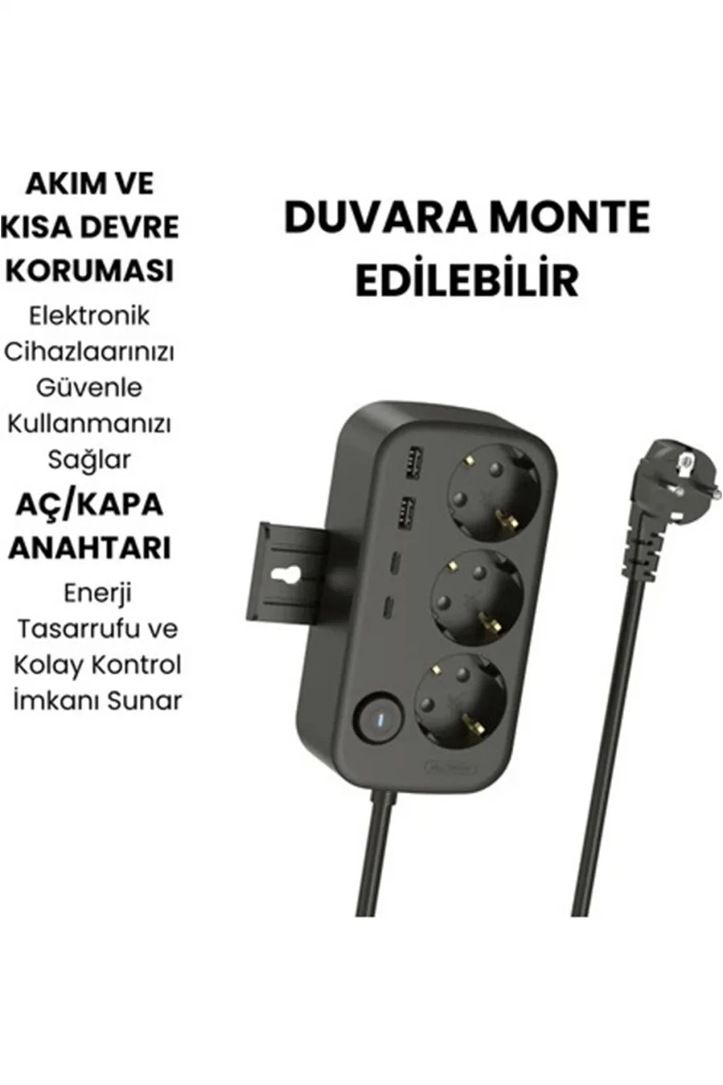 3’lü Akım Korumalı Priz | 2 USB + 2 Type-C Girişli | Anahtarlı ve Duvara Monte Edilebilir Uzatma Kablosu – Siyah Pratik, Güçlü ve Güvenli Ev, ofis ve çalışma alanlarında kablo karmaşasına son verin 3’lü priz girişi, 2 USB ve 2 Type-C portuyla tüm cihazlarınızı aynı anda şarj edebilir, akım koruma özelliği sayesinde güvenli bir kullanım sağlayabilirsiniz.