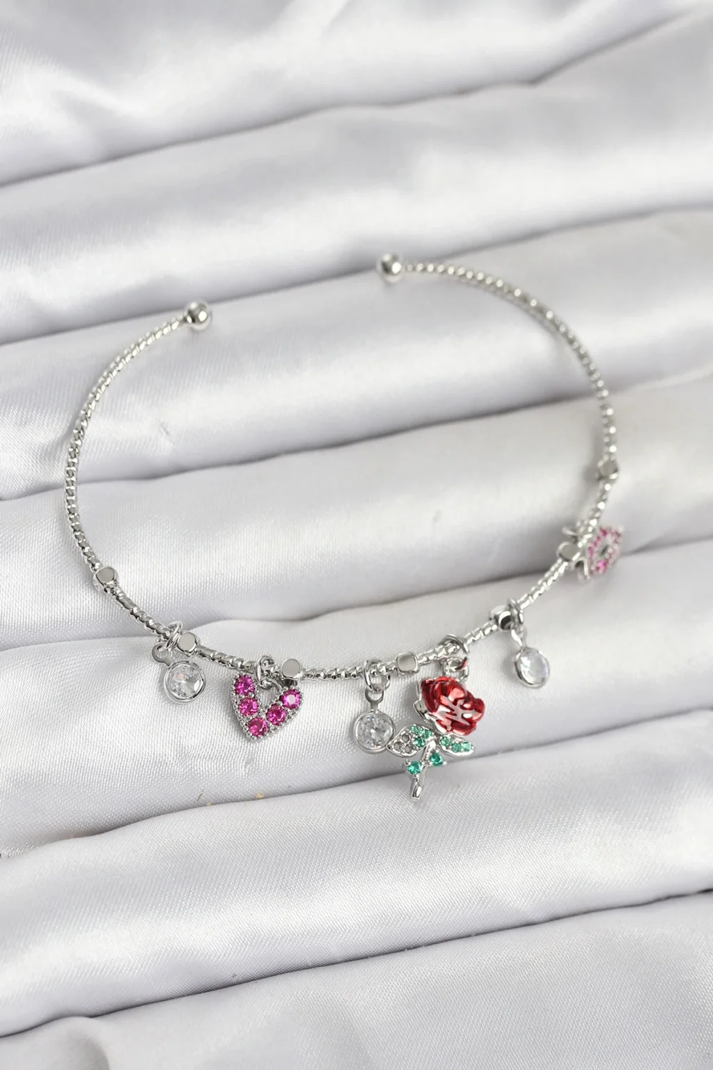 Populermarketim - Gül Charmlı Gümüş Renk Pirinç Kadın Bileklik