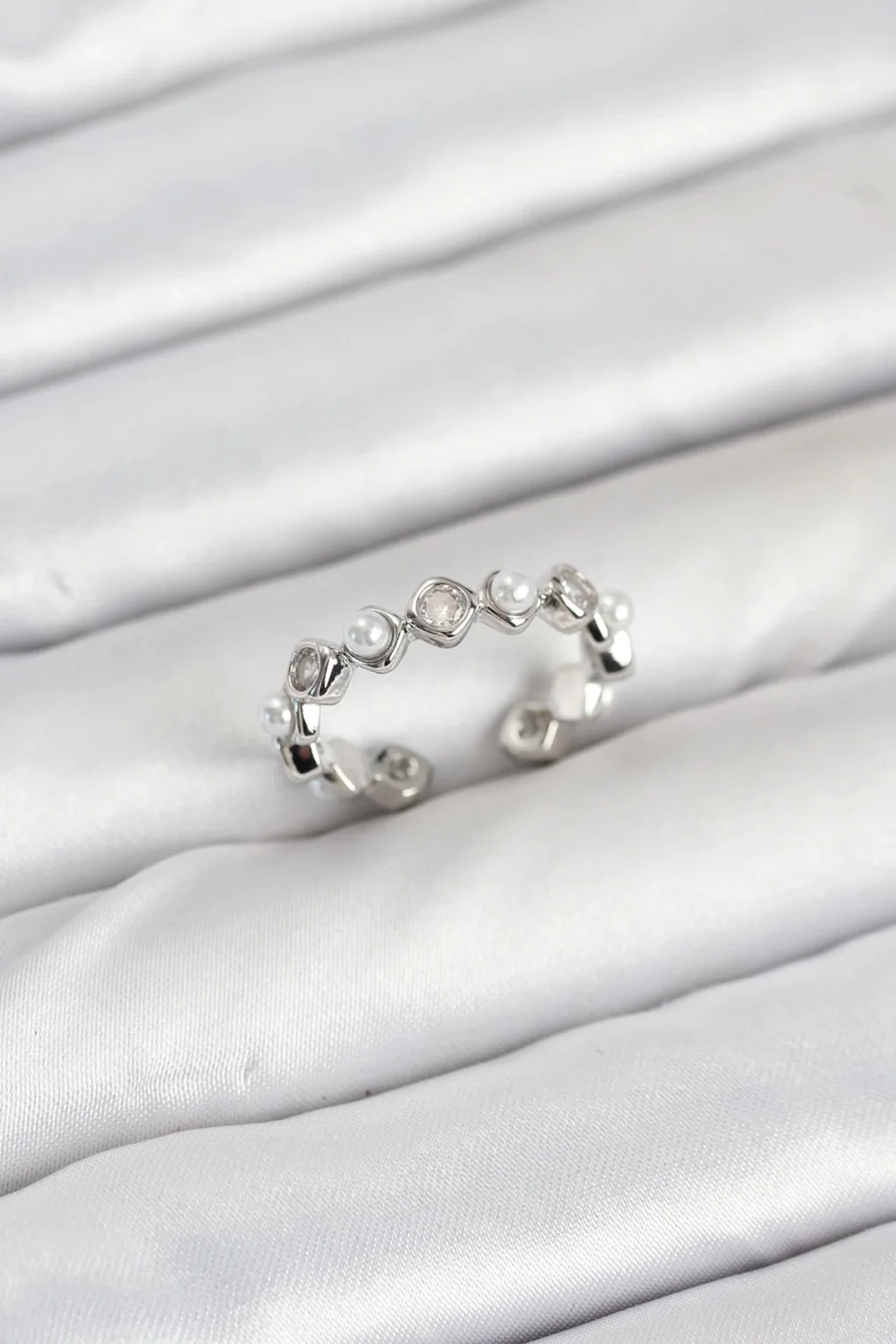 Populermarketim - Pirinç Gümüş Renk Zirkon Taşlı İncili Kadın Yüzük